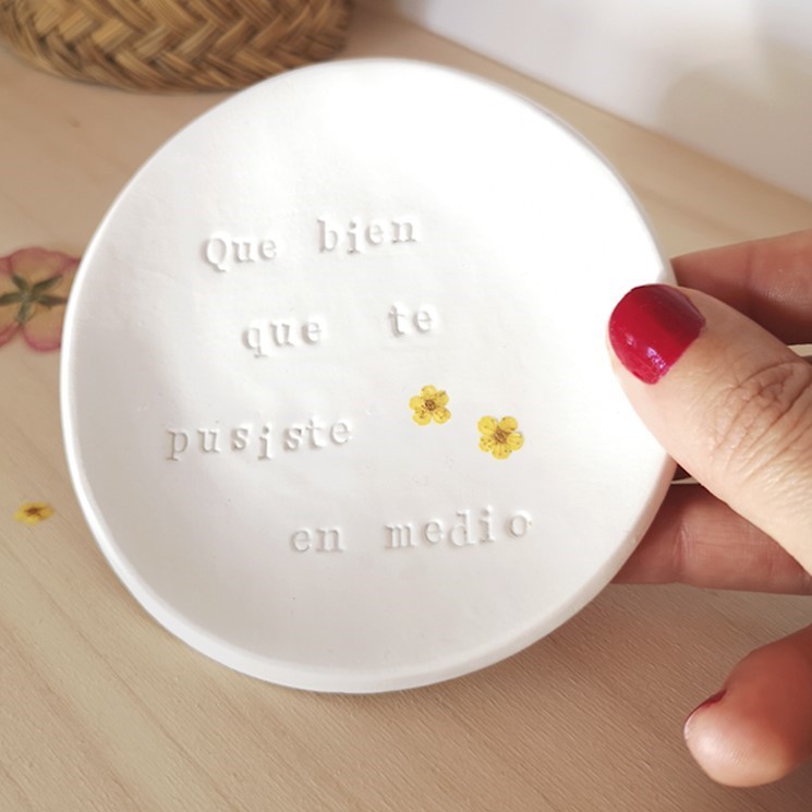 Escribe la frase que quieres en la cajita de texto, si quieres que lo prepare con agujeritos para atar los anillos o colgarlo, escríbelo también. Selecciona la cinta que quieres del desplegable y en un máximo de 10 días laborables te enviamos tu porta alianzas a casa. ¡Fácil!
