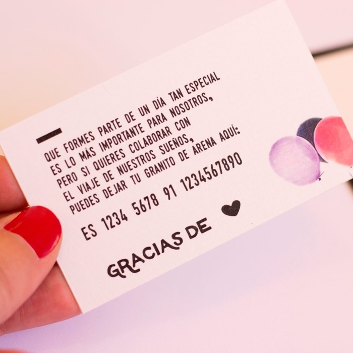 La tarjeta número de cuenta es una bonita forma de decirle a los invitados, desde el cariño, cómo haceros llegar su colaboración con vuestro regalo soñado. Acompañada de la invitación y con el mismo diseño, ambos se complementan y forman un tándem ideal.